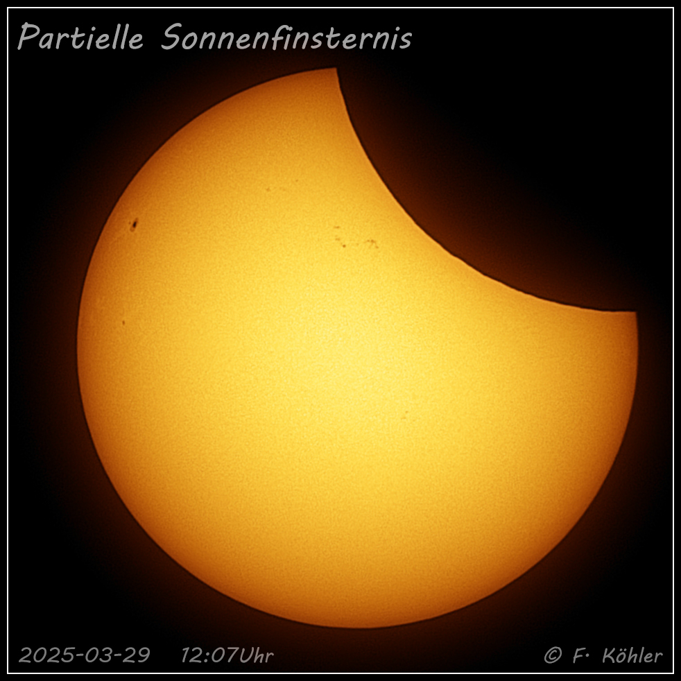 An diesem Tag war ich zu einem astronomischen Seminar in Kalbach/Rhön. Die zwei Tage davor hatten wir wunderbares Wetter mi einer klasse Transparenz. Leider zogen in der Nacht zum Samstag Wolken auf und es regnete zeitweise leicht. An die Beobachtung der Finsternis war nicht zu denken.